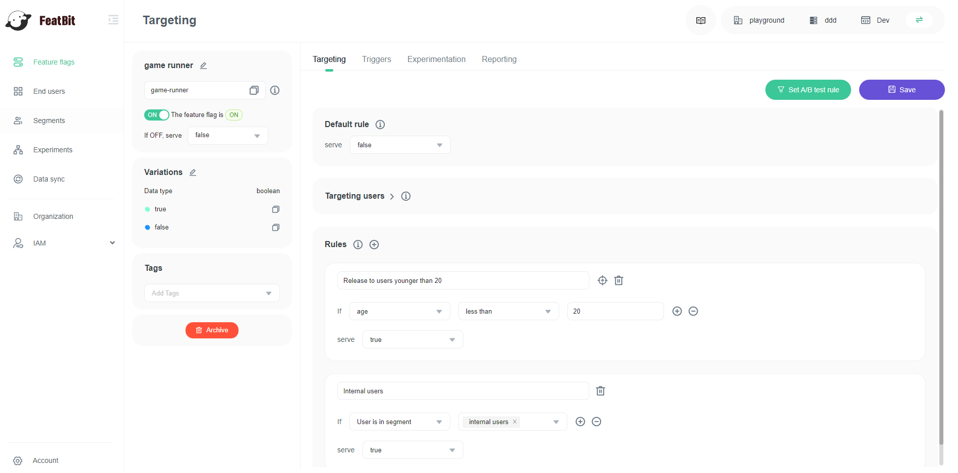 1. Go to the feature flag game runner's targeting page, set the default rule to return false and add the following two rules